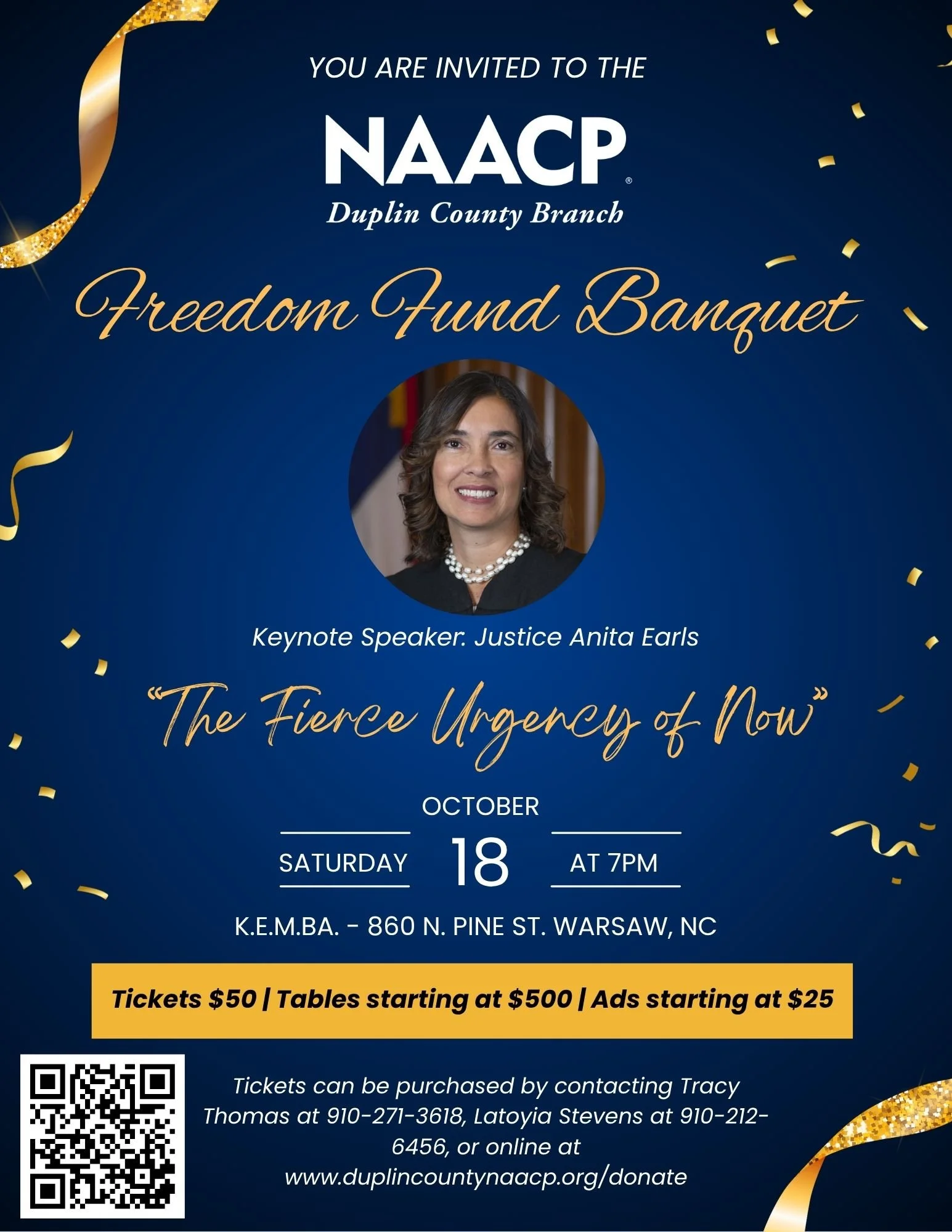 Your donations are the reasons why we can continue to fight for equality, social justice, and aid our social justice initiatives across Duplin County. Please consider giving a donation, and we will continue to promote diversity, equity, and inclusion for ALL Duplin County residents. Cash and check donations can be mailed to P.O. Box 764, Rose Hill, NC 28458. For Cashapp donations, send to $DuplinNAACP. Please specify if it’s a general donation or for the Dr. Obasahan scholarship.